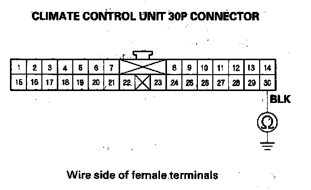 6. Check for continuity between the No. 30 terminal of the climate control unit 30P connector and body ground.