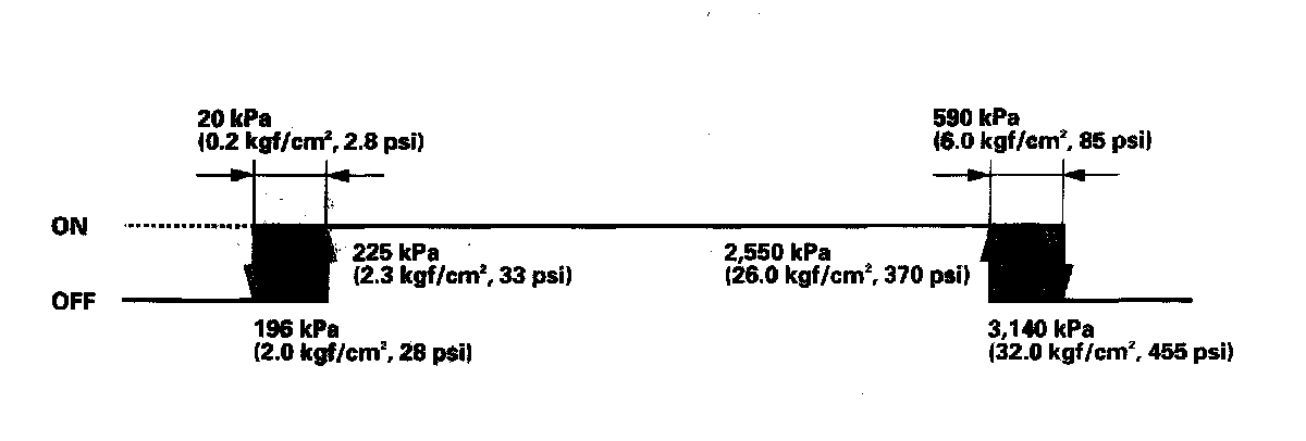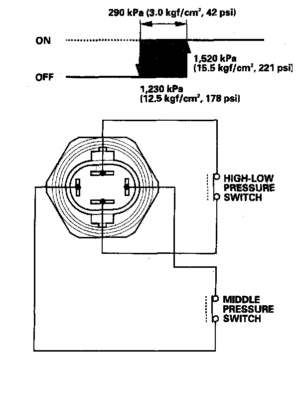 If the refrigerant pressure goes above 1,520 kPa (15.5 kgf/sq.cm square ,221 psi), the A/C pressure switch closes to signal the PCM to change the speed of the A/C condenser fan and radiator fan to high. When the refrigerant pressure drops below 1,230 kPa (12.5 kgf/sq.cm square ,178 psi), the A/C pressure switch opens to signal the PCM to change the speed of the A/C condenser fan and radiator fan to low.