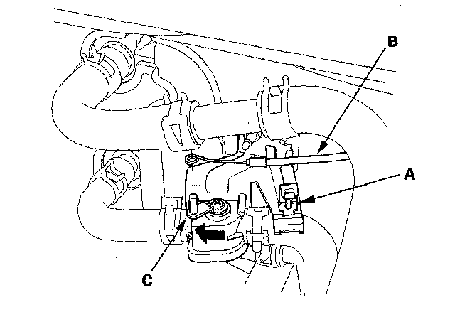 4. From under the hood, open the cable clamp (A), then disconnect the heater valve cable (B) from the heater valve arm (C). Turn the heater valve arm to the fully opened position as shown.