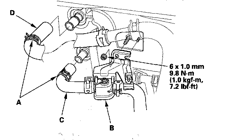6. Slide the hose clamps (A) back. Remove the nut and the water valve (B), then disconnect the inlet heater hose (C) and the outlet heater hose (D) from the heater unit. Engine coolant will run out when the hoses are disconnected; drain it into a clean drip pan. Be sure not to let coolant spill on the electrical parts or the painted surfaces. If any coolant spills, rinse it off immediately.