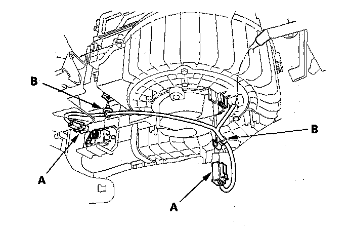 9. Disconnect the connectors (A) from the blower motor and the power transistor, then remove the wire harness clips (B).