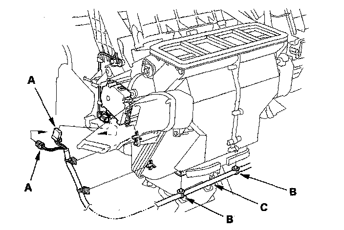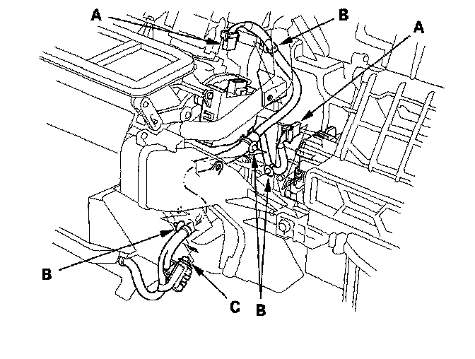 11. Disconnect the connectors (A) from the evaporator sensor and the air mix control motor, then remove the wire harness clips (B) and the wire harness (C).