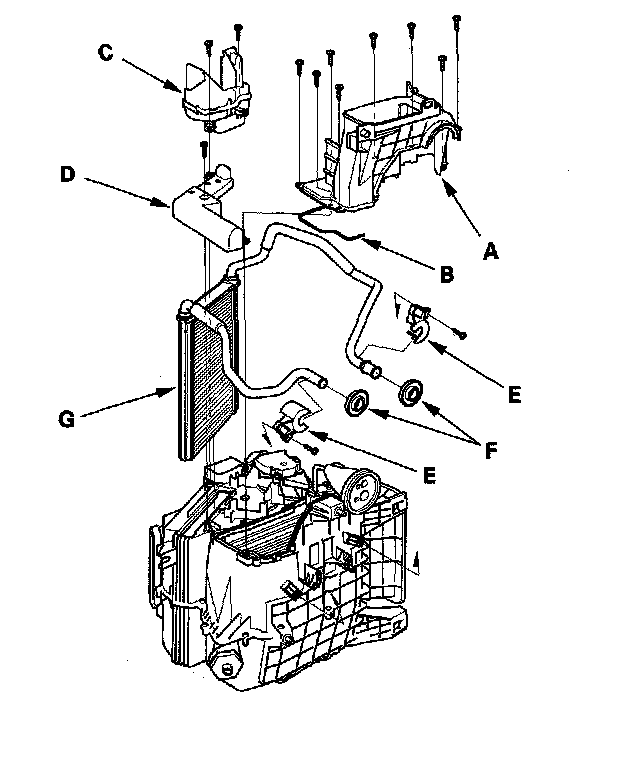13. Remove the self-tapping screws, the joint duct (A), and seal (B). Remove the self-tapping screws, then remove the passenger's heater outlet (C), and the heater core cover (D). Remove the self-tapping screws, the heater pipe brackets (E), the grommets (F), and carefully pull out the heater core (G) so you don't bend the inlet and outlet pipes.