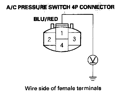 4. Measure the voltage between the No. 1 terminal of the A/C pressure switch 4P connector and body ground.