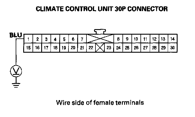 10. Measure the voltage between the No. 1 terminal of the climate control unit 30P connector and body ground.