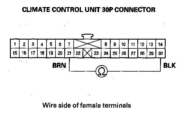 12. Measure the evaporator temperature sensor resistance between the No.21 and No. 30 terminals of the climate control unit 30P connector.