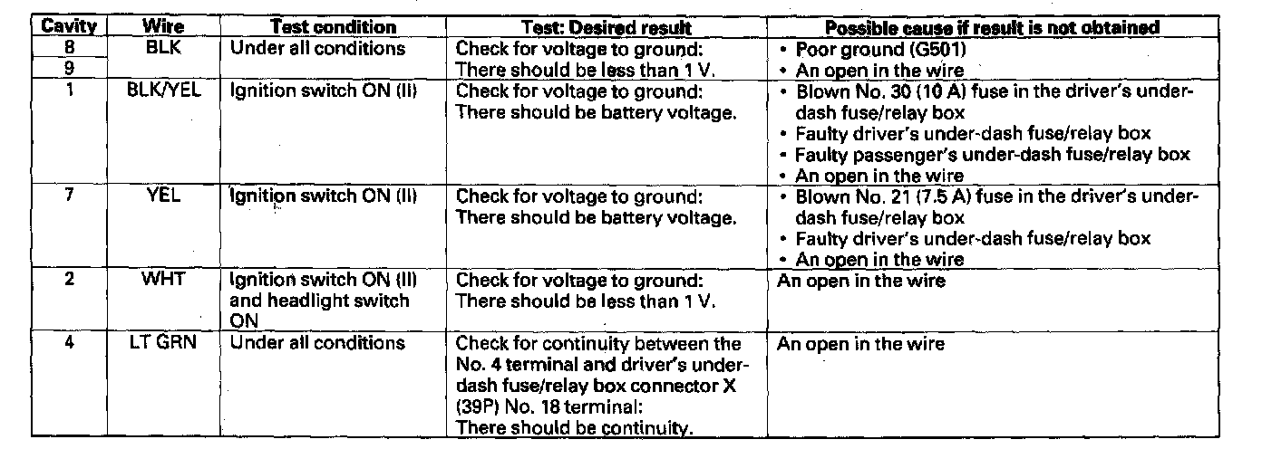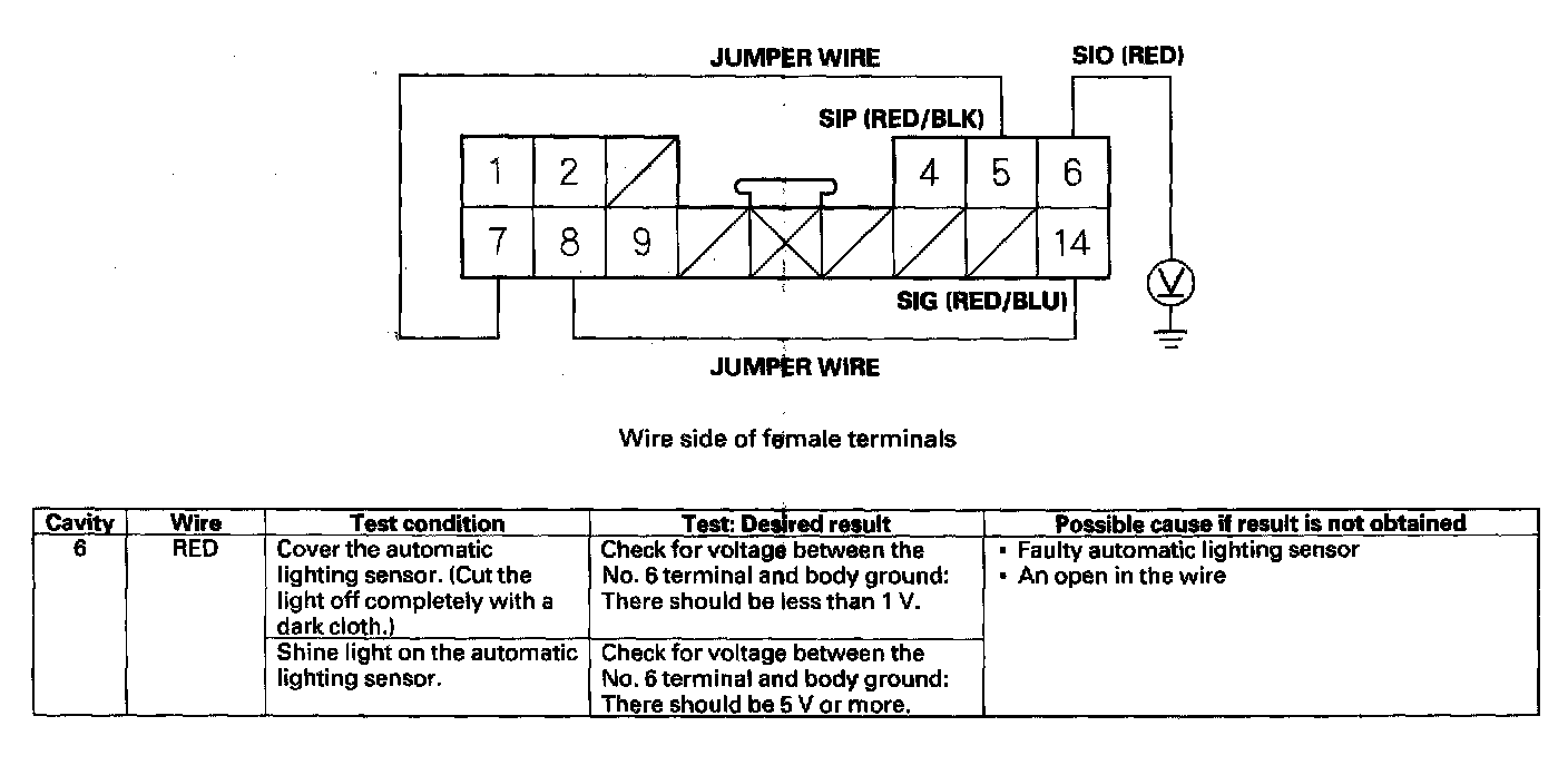 5. Reconnect the automatic lighting control unit connector, then make these input tests at the connector.