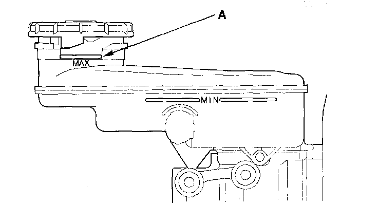 1. Make sure the brake fluid level in the reservoir is at the MAX (upper) level line (A).