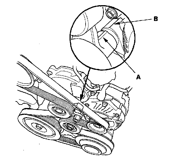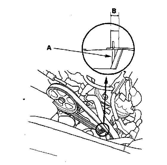 2. Check that the auto-tensioner indicator (A) on the oil pump not beyond the edge of the indicator rib (B) on the auto-tensioner. If the pointer is beyond the indicator rib, replace the drive belt.