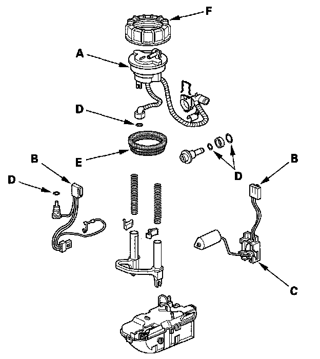 - When installing the fuel gauge sending unit (C), make sure the connection is secure and the connector is firmly locked into place. Be careful not to bend or twist it excessively.