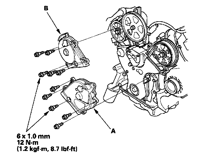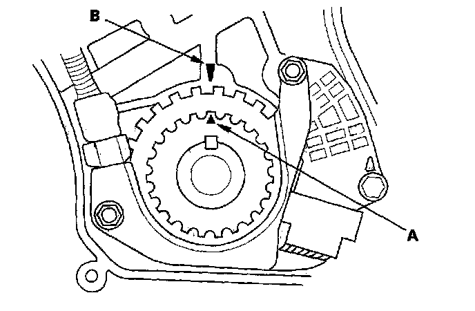 3. Set the timing belt drive pulley to top dead center (TDC) by aligning the TDC mark (A) on the tooth of the timing belt drive pulley with the pointer (B) on the oil pump.