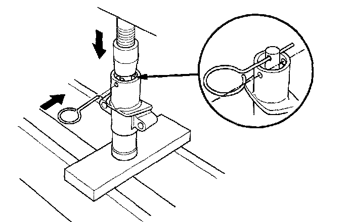 8. Use a hydraulic press to slowly compress the auto-tensioner. Insert a 2.0 mm (0.08 inch) pin through the housing and the rod.