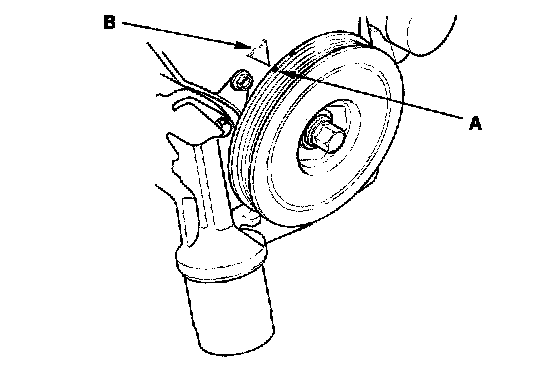 22. Turn the crankshaft pulley so its white mark (A) lines up with the pointer (B).