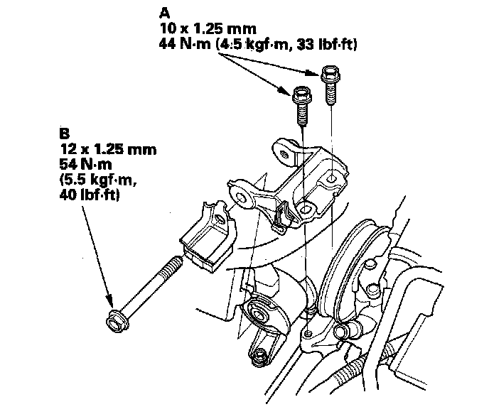 24. Install the upper half of the side engine mount bracket, and tighten the new mounting bolts (A), then the mass damper mounting bolt (B).