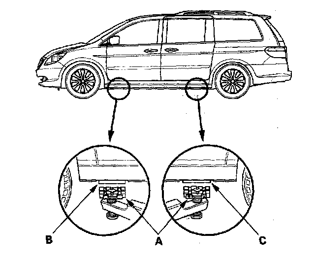 1. Position the hoist lift blocks (A), under the vehicle's front support points (B) and rear support points (C).