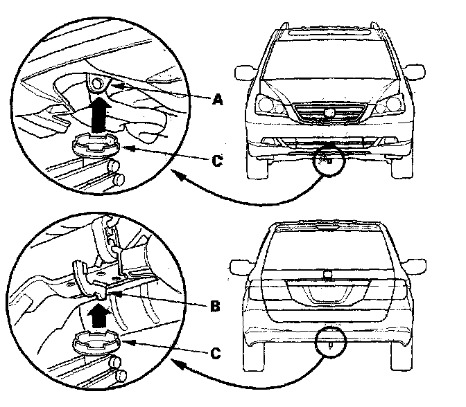3. Position the floor jack under the front jacking bracket (A) or rear jacking bracket (B). Center the jacking racket in the jack lift platform (C) and jack up the vehicle high enough to fit the safety stands under it.