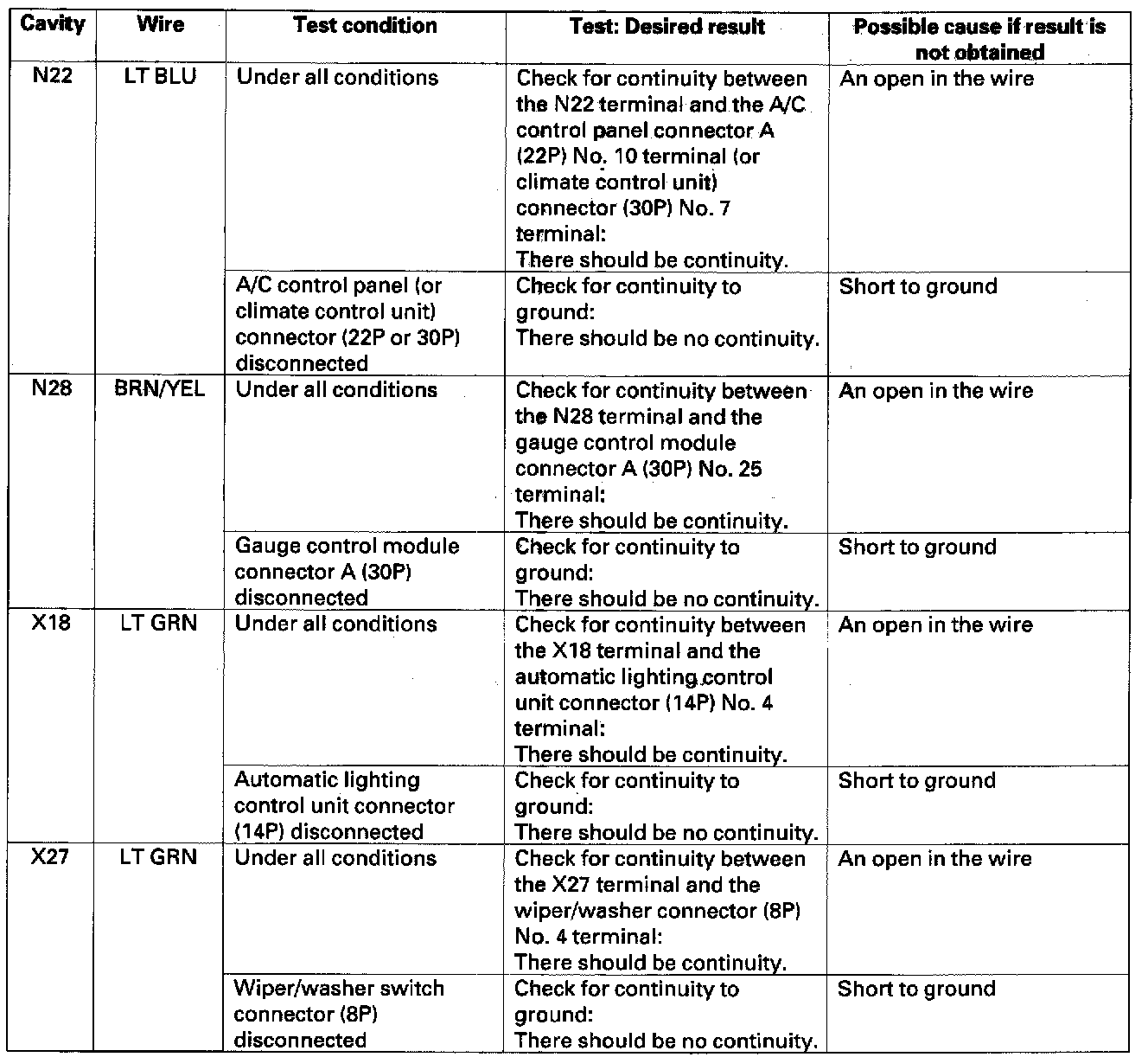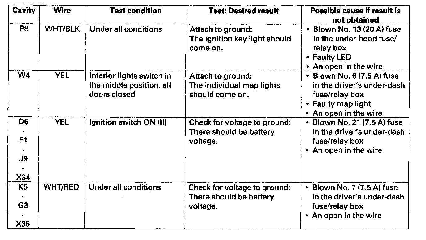 5. Reconnect the connectors to the driver's under-dash fuse-relay box, and make sure these input tests at the appropriate connectors on the driver's under-dash fuse/relay box.