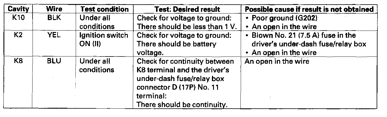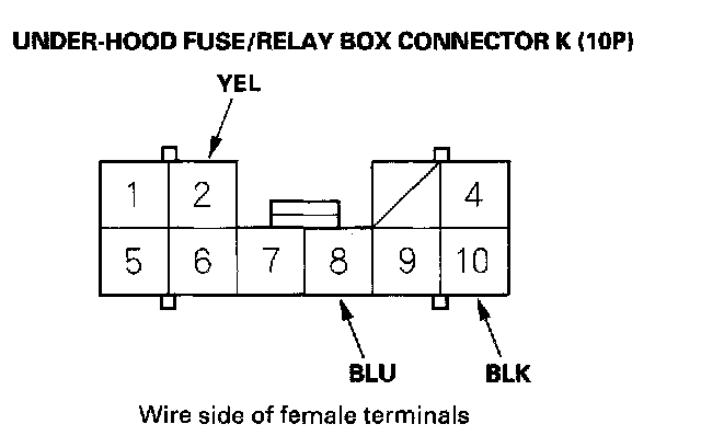 4. Reconnect the connector to the under-hood fuse/relay box, and make these input tests at the connector.