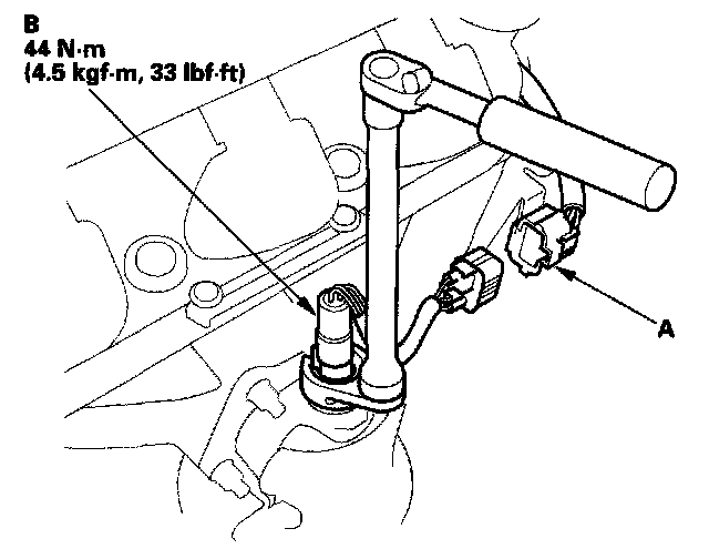 1. Disconnect the rear A/F sensor 8P connector (A), then remove the rear A/F sensor (B).