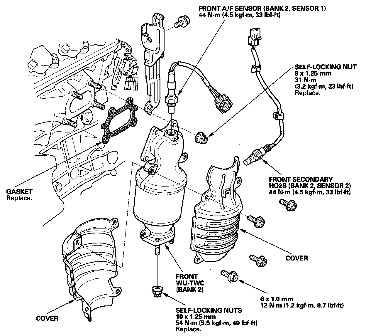 2. Disconnect the front air fuel ratio (A/F) sensor connector and front secondary heated oxygen sensor (secondary HO2S) connector.