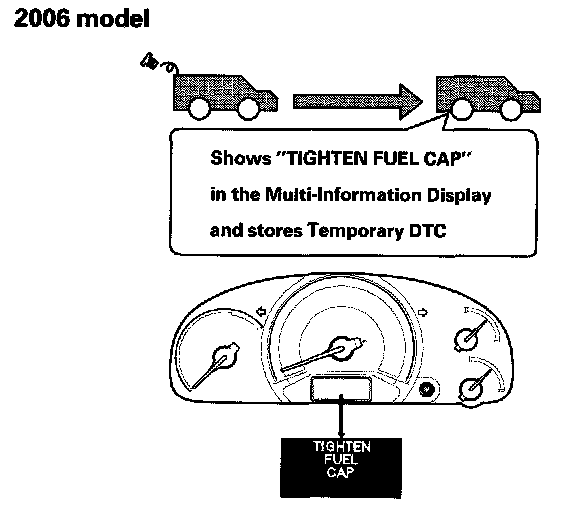 During the second drive cycle after a cold start, if the fuel fill cap is still loose or missing, the PCM alerts the driver to check the fuel fill cap by showing a "CHECK FUEL CAP" (2005 model) ("TIGHTEN FUEL CAP" (2006 model)) message in the multi-information display as same as the first drive cycle. Tightening the fuel cap does not make the message go off immediately.