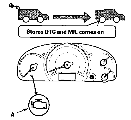 During the third drive cycle after a cold start, if the fuel fill cap is still loose or missing, the PCM stores DTC P0457 "Evaporative Emission (EVAP) System Leak Detected/Fuel Fill Cap Loose or Missing". The malfunction indicator lamp (MIL) (A) comes on, and the "CHECK FUEL CAP" message goes off.
