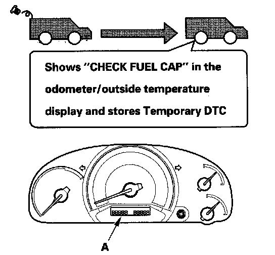 During the first drive cycle after a cold start, the PCM alerts the driver to check the fuel fill cap by showing a "CHECK FUEL CAP" message in the odometer/outside temperature display (A), and it stores Temporary DTC P0457 "Evaporative Emission (EVAP) System Leak Detected/Fuel Fill Cap Loose or Missing". Tightening the fuel cap does not make the message go off immediately.