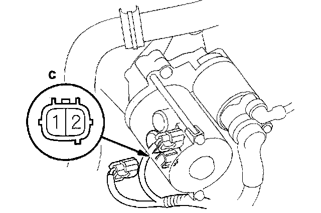 11. Connect the battery negative terminal to shift solenoid valve C connector terminal No. 1, and connect the battery positive terminal to the terminal No. 2. A clicking sound should be heard.