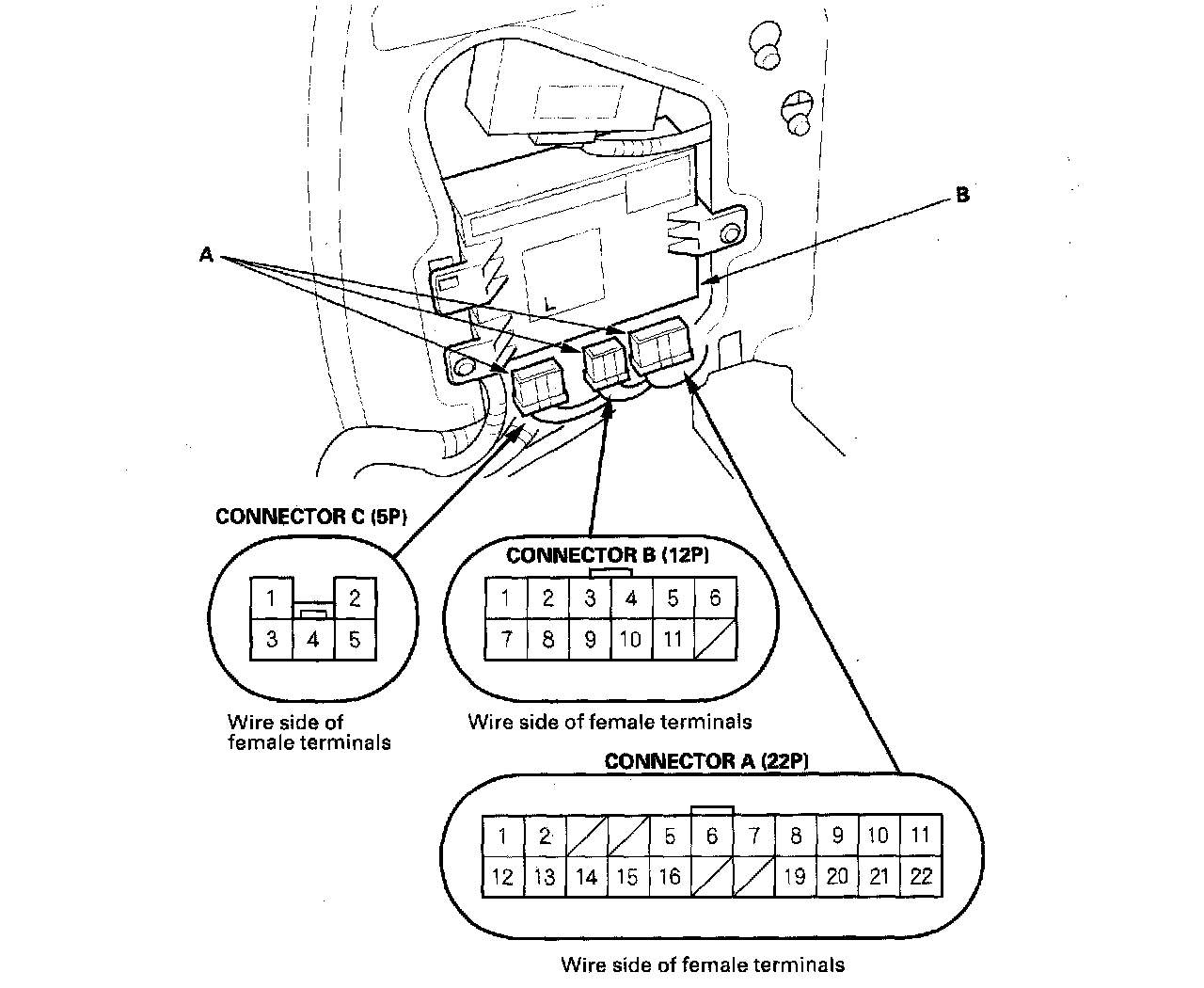 3. Disconnect the 22P, 12P, and 5P connectors (A) from the left power sliding door control unit (B).