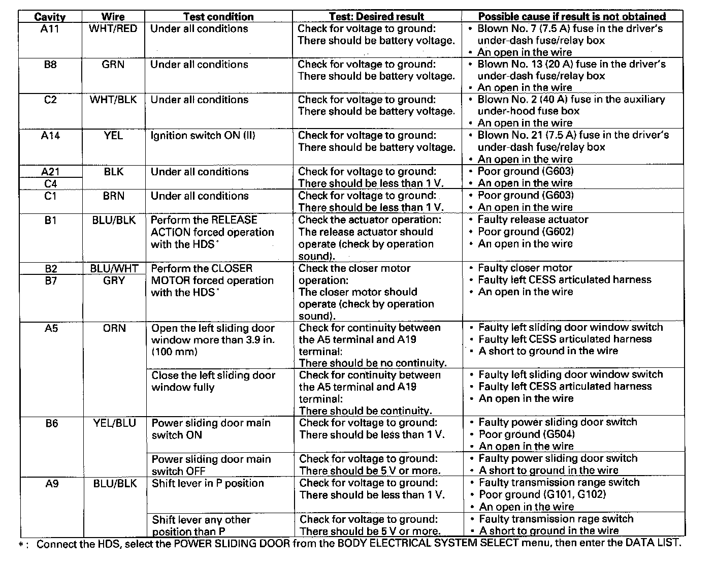 5. Reconnect all connectors to the left power sliding door control unit, and make these input tests at the appropriate connector.
