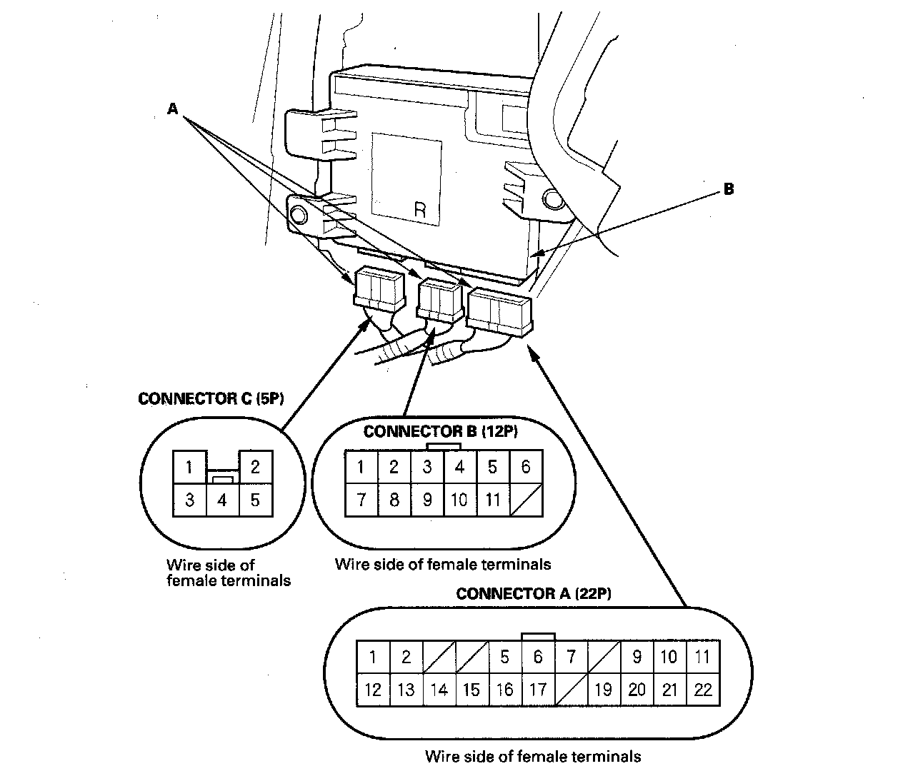 3. Disconnect the 22P, 12P, and 5P connectors (A) from the right power sliding door control unit (B).