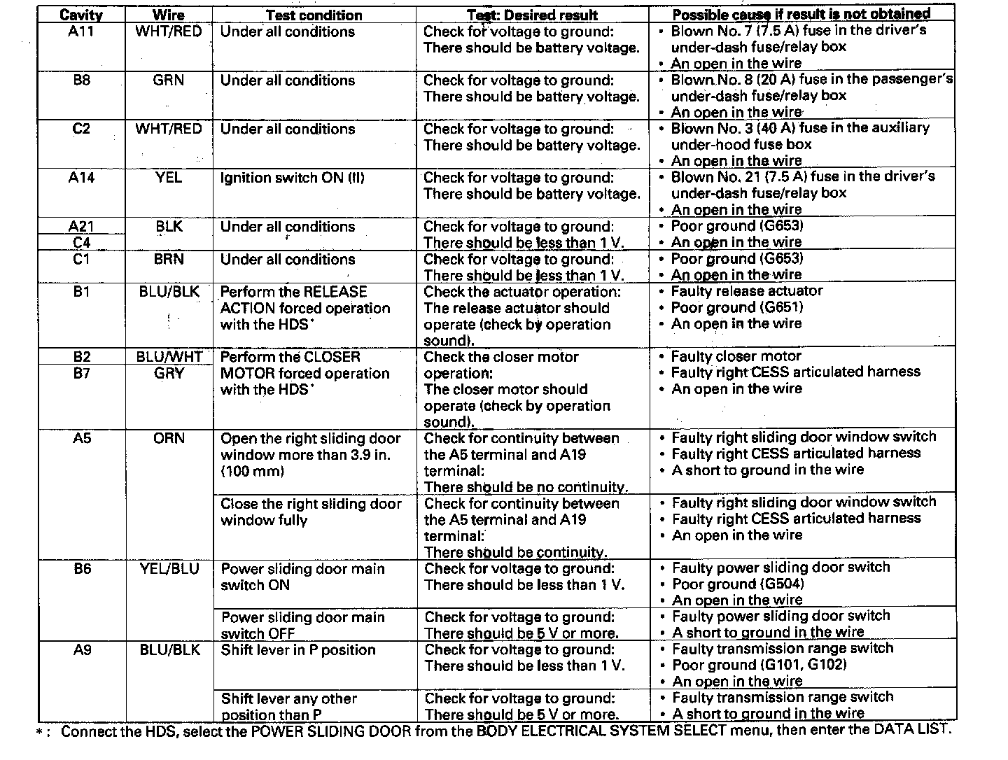 5. Reconnect all connectors to the right power sliding door control unit, and make these input tests at the appropriate connector.
