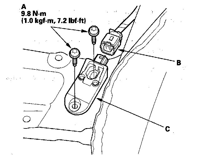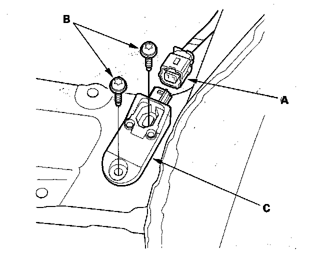 1. Install the new front impact sensor with Torx bolts (A), then connect the engine compartment wire harness 2P connector (B) to the front impact sensor (C).
