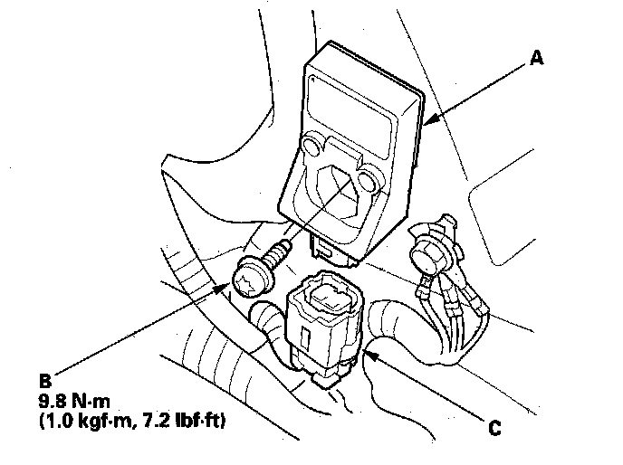 1. Install the new side impact sensor (first) (A) with Torx bolt (B), then connect the floor wire harness 2P connector (C) to the side impact sensor (first).