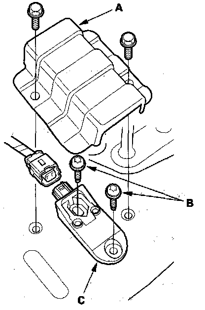 1. Install the new rear safing sensor (A) with Torx bolts (B) then connect the floor wire harness 2P connector (C) to the rear safing sensor.