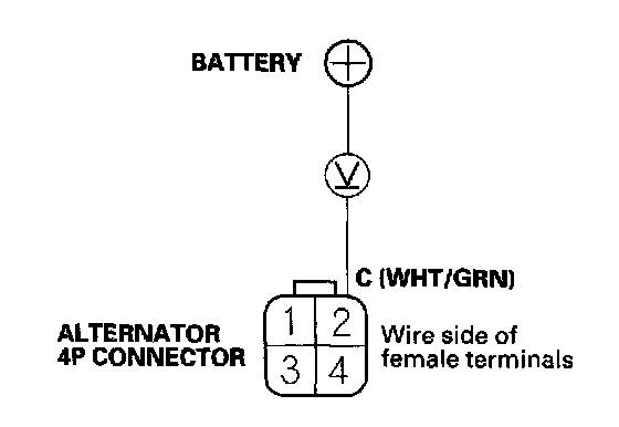 5. Measure the voltage between alternator 4P connector terminal No. 2 and the positive terminal of the battery.