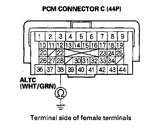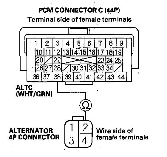 11. Check for continuity between PCM connector terminal C38 and alternator 4P connector terminal No. 2.