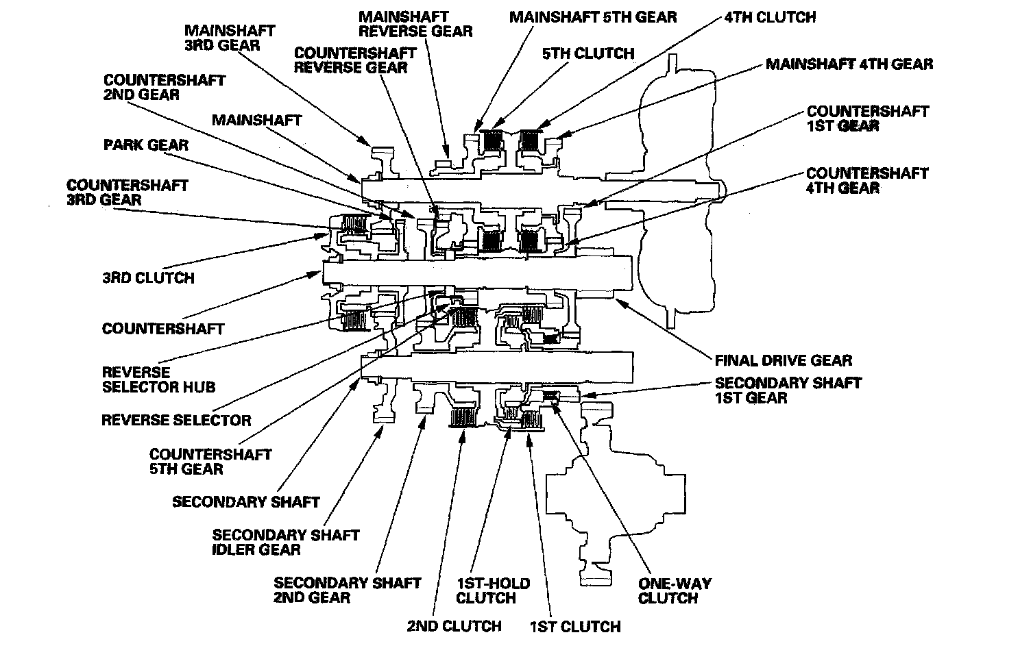 ^ 1st gear is engaged/disengaged with the secondary shaft by the 1st clutch. 1st gear is engaged with the secondary shaft by the one-way clutch and the 1st-hold clutch when decelerating for engine braking.