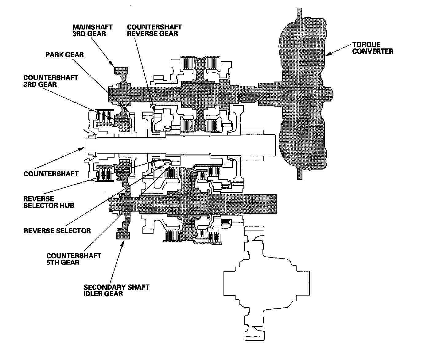 ^ Final gear is integral with the countershaft. ^ 1st gear, 4th gear, 2nd gear, and park gear are splined with the countershaft, and rotate with the countershaft.
