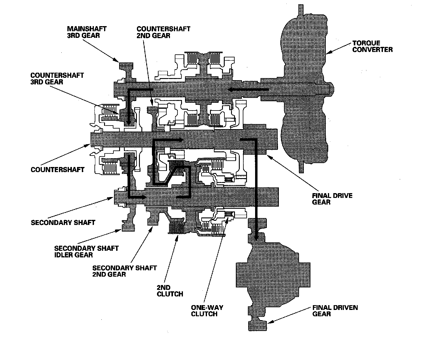 ^ Hydraulic pressure is applied to the 2nd clutch, then the 2nd clutch engages the secondary shaft 2nd gear with the secondary shaft.