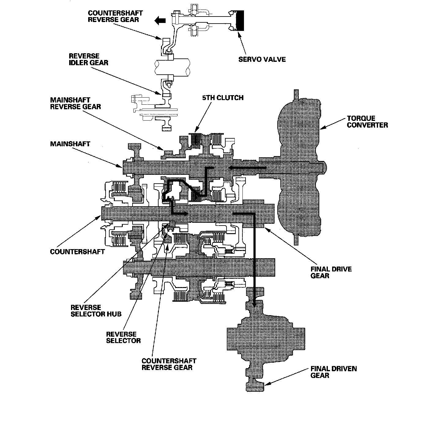 ^ Hydraulic pressure is applied to the servo valve to engage the reverse selector with the countershaft 5th gear while the shift lever in the forward range (D, 2, and 1 positions).