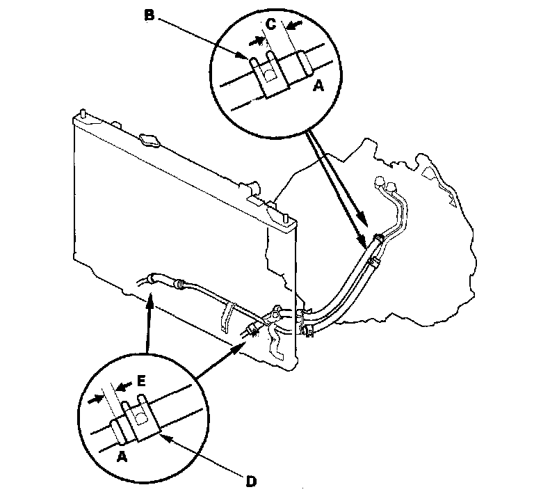 3. Secure the hoses at the ATF cooler with the clips (D) at 2 - 4 mm (0.1 - 0.2 inch) (E) from the hose ends.