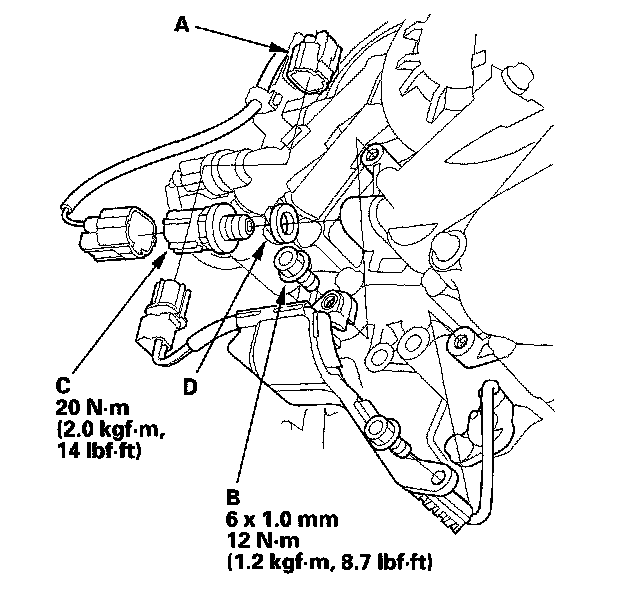 6. Install the new switch with a new sealing washer (D). Tighten the switch on the metal part, not the plastic part.