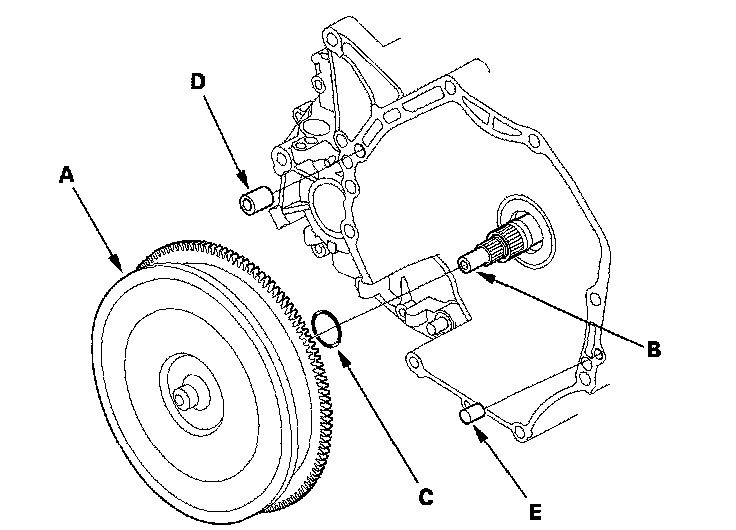 3. Install the 14 x 20 mm dowel pin (D) and 10 x 20 mm dowel pin (E) in the torque converter housing.