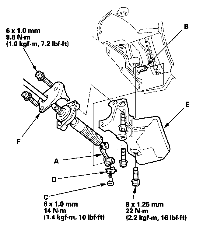 32. Install the shift cable cover (E), and secure the shift cable holder (F) on the shift cable cover.