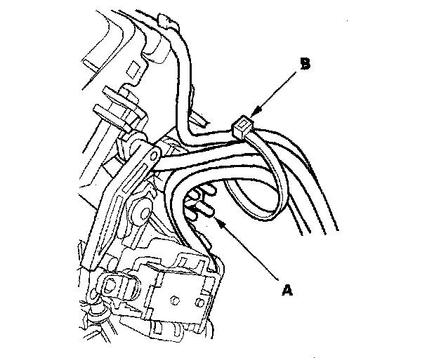 7. Route the harnesses along the harness guide (A), and tie the harnesses and guide with the new band (B).