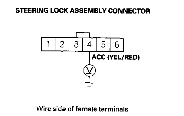5. Check for the voltage between steering lock assembly connector terminal No. 4 and body ground.
