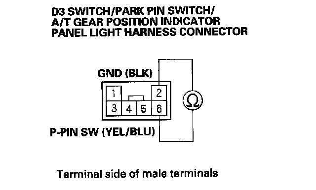 8. Check for continuity between D3 switch/park pin switch/A/T gear position indicator panel light harness connector terminals No. 2 and No. 6 while the shift lever is in the P position, and when the shift lever out of the P position.