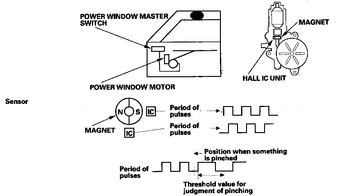 The driver's power window motor incorporates a pulser which generates pulses during the motor's operation and sends the pulses to the driver's power window control unit. As soon as the power window control unit detects no pulses from the pulser, the driver's power window control unit makes the power window motor stop and reverse. If the window is more than halfway closed, it will reverse to half open position. If the window is less than halfway closed, it will stop and reverse about 2 inches. This is to prevent pinching your hand or finger's during auto-up operation. The anti-pinch is not active when the switch is held in the up position.