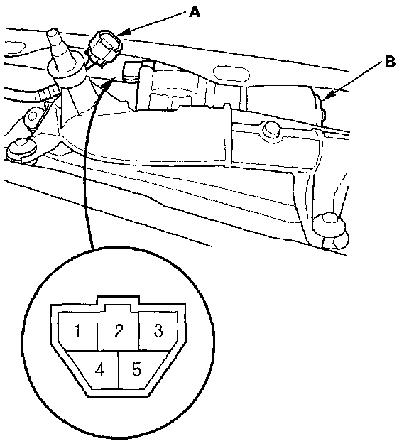 3. Disconnect the 5P connector (A) from the wiper motor (B).